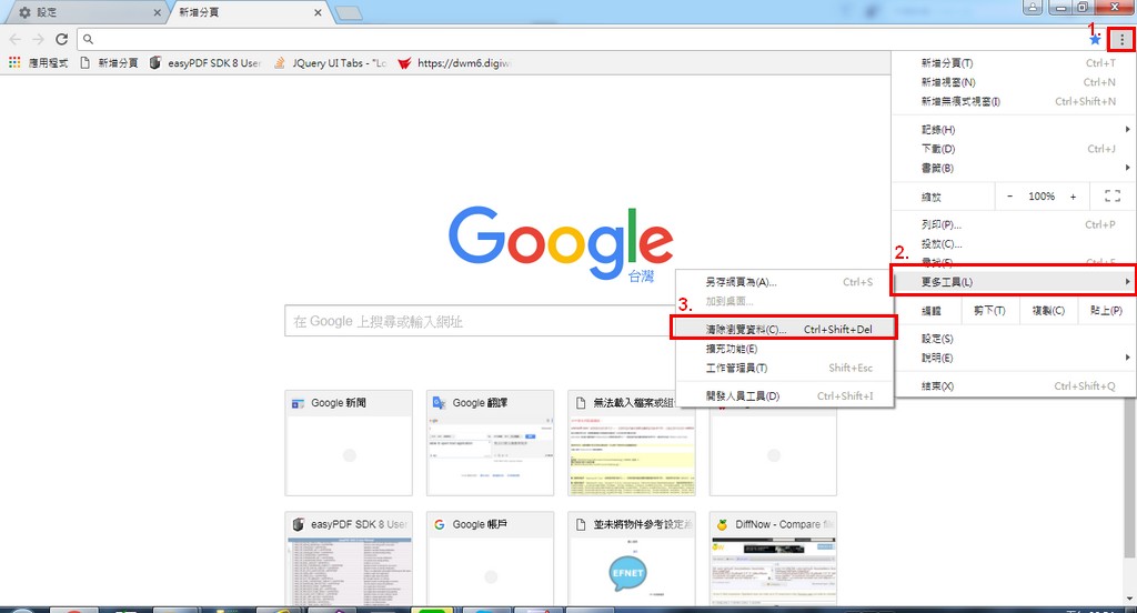 1.請點選右上角的【...】(直的)或是板手符號,選擇【更多工具】中的【清除瀏覽資料】。