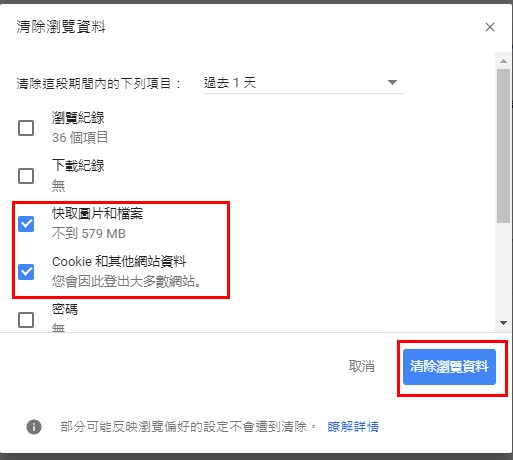 2.請勾選【快取圖片和檔案】、【Cookie和其他網站資料】,然後按下【清除瀏覽資料】。
