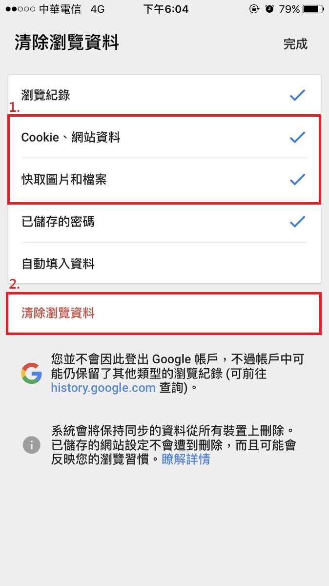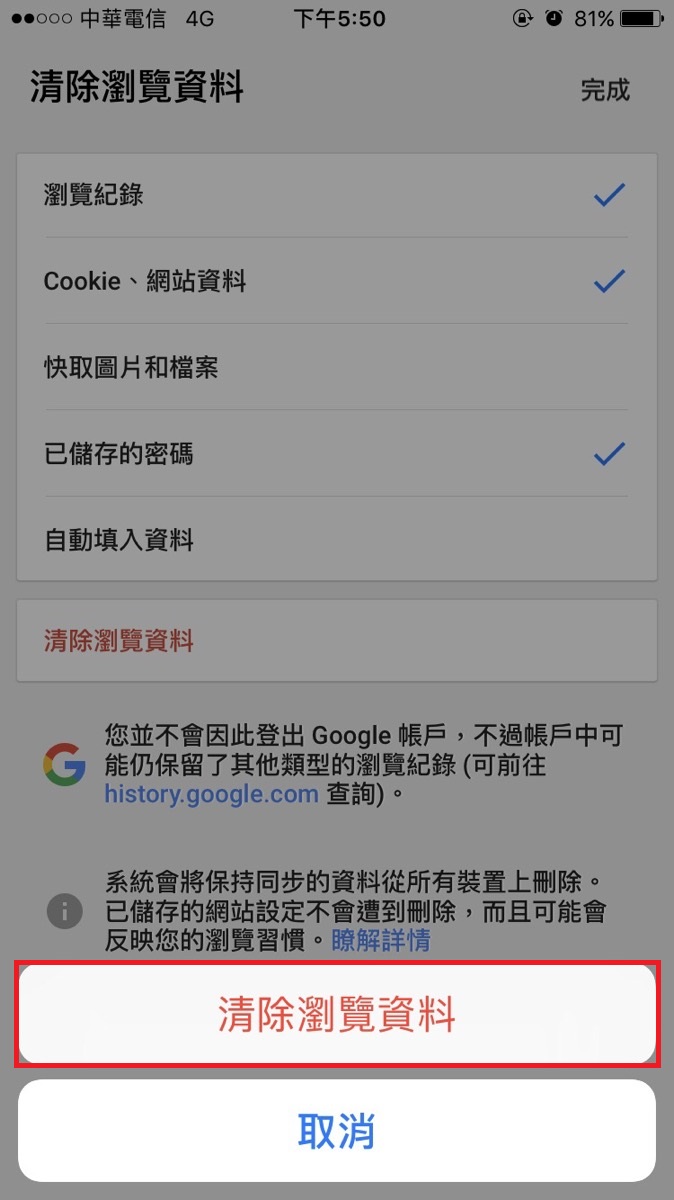 4.請將【Cookie、網站資料】以及【快取圖片和檔案】打勾,然後輕觸下方的【清除瀏覽資料】。
