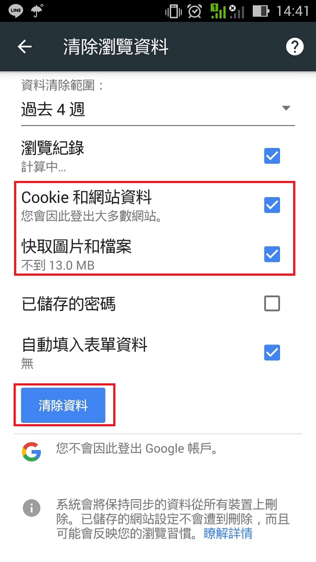 4.請勾選【快取圖片和檔案】以及【Cookie和網站資料】,接著輕觸下方的【清除資料】。