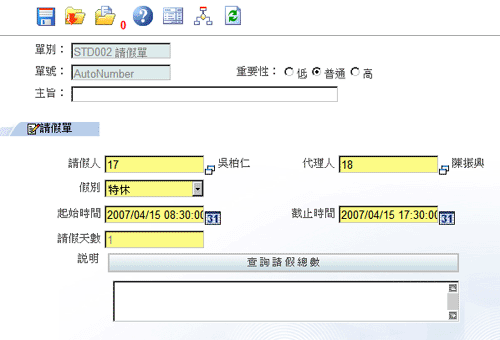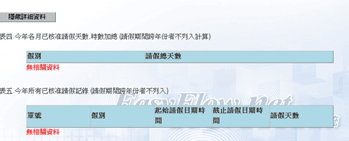 1. 當填表人按下〔查詢請假總數〕的按鈕時,則系統將根據填表人所填的請假人,而列出該請假人的: