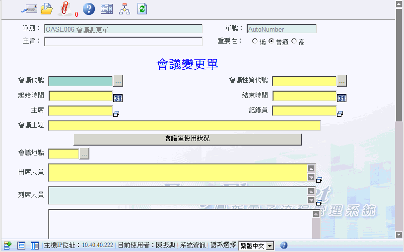 在會議通知單已發送過通知給所有與會人員後,若是發現會議有任何異動,例:會議時間更動或是人員變更時,則使用者可以填寫此表單,並重新寄發通知給所有的人員。 |