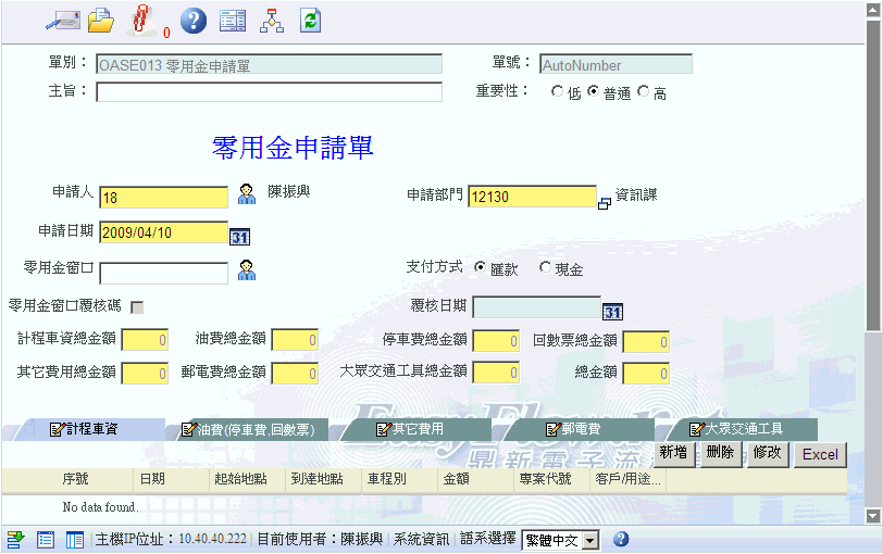 • 當您需要申請零用金,可以開啟EasyFlow使用本表單填寫零用金申請單的相關資訊,如:計程車資、油費、其他費用、郵電費、大眾交通工具等。