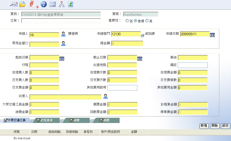 首 頁 --> OAS 電子表單清單 --> 國內出差旅費報告