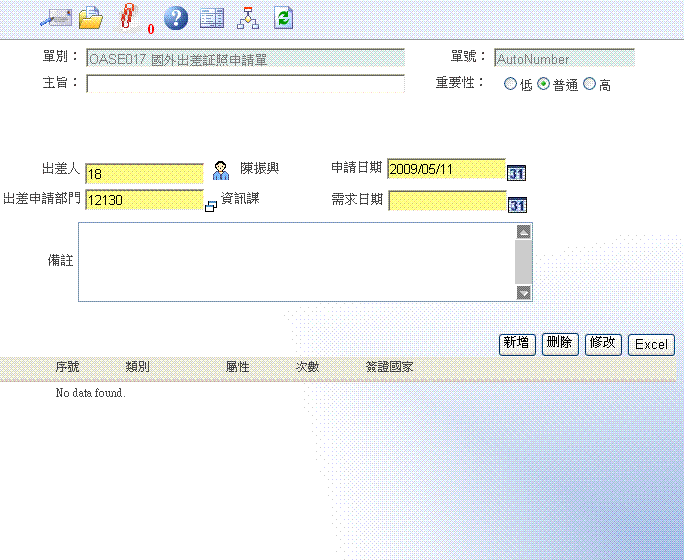 首 頁 --> OAS 電子表單清單 --> 國外出差證照申請