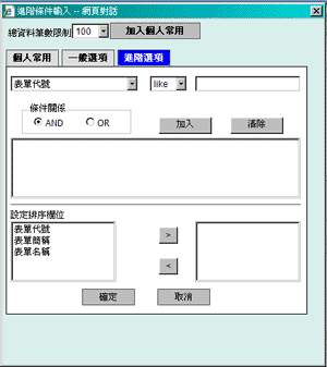 選擇您要篩選的欄位,輸入條件後,按下[加入]按鈕將您所輸入的條件加入條件式中。